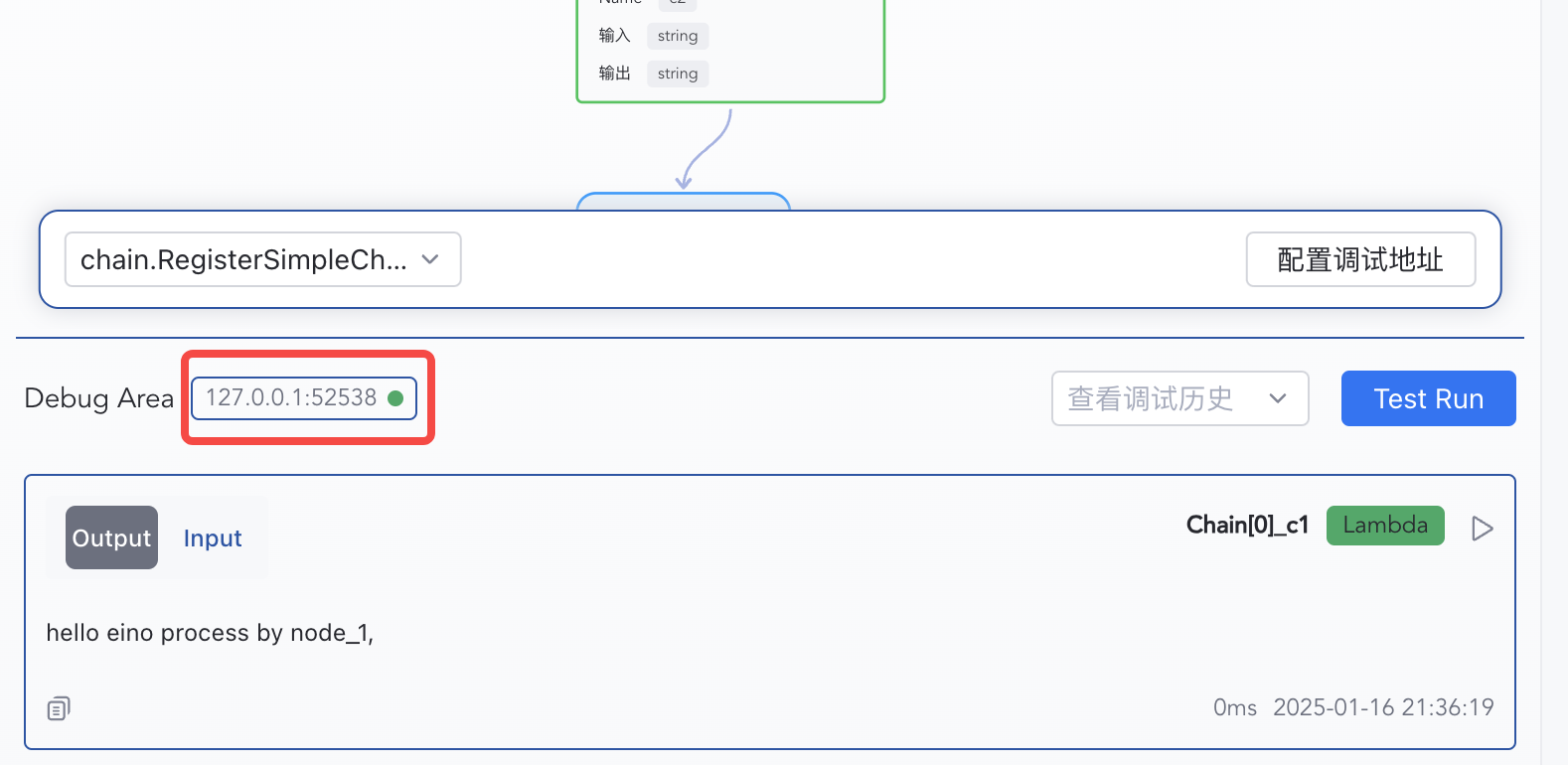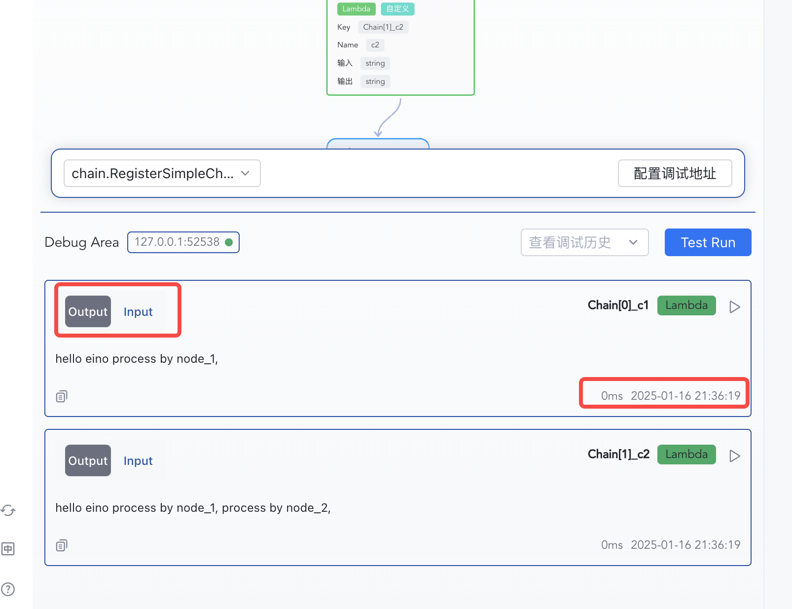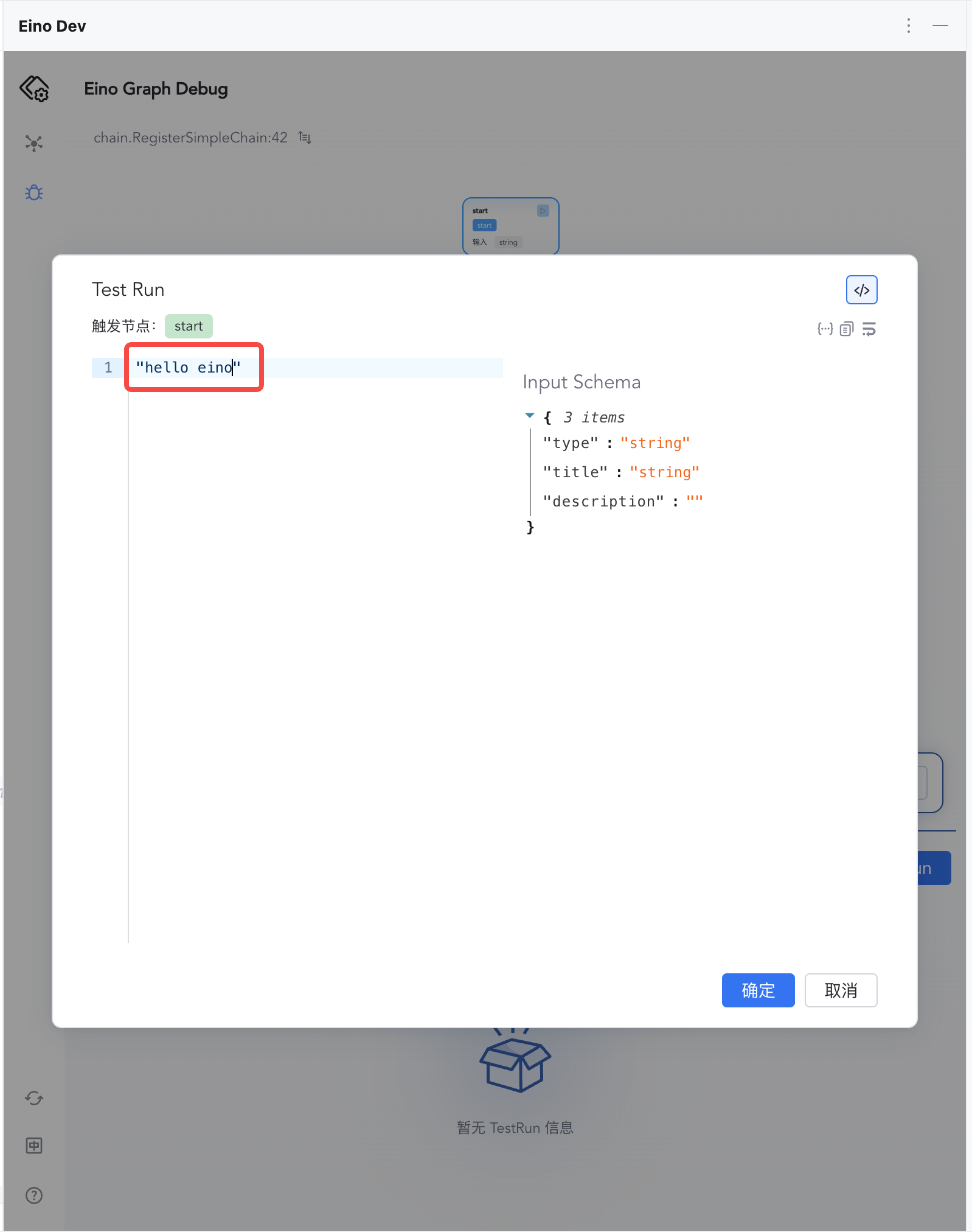 - Start debugging from the START node: Click “Test Run”, enter the mock input (if the input is complex, the input structure will be inferred automatically), and then click Confirm to execute your graph. The result of each node will be displayed below.