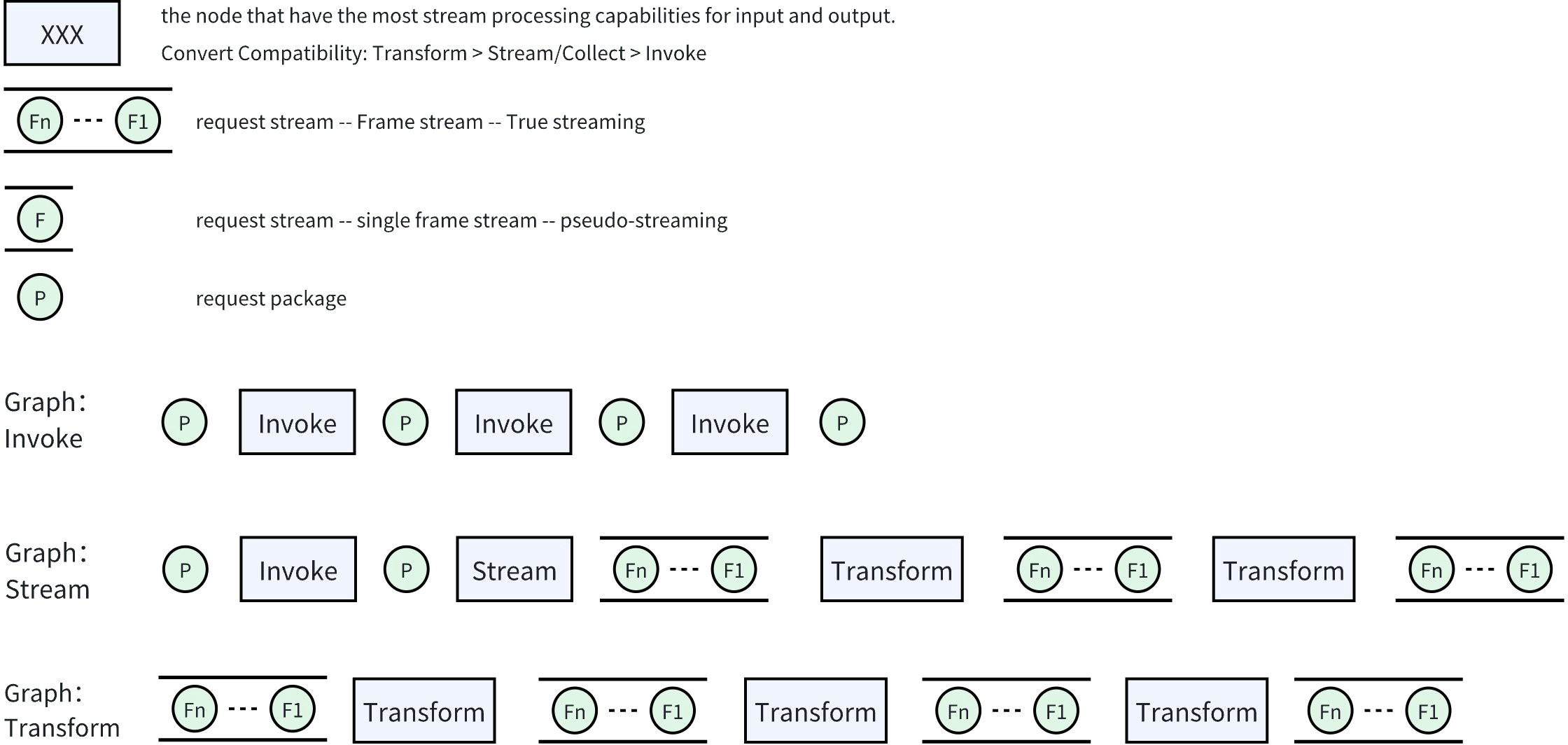 - Based on these two conversion relationships, Eino can encapsulate and convert any interface with N(N<=4) interaction modes provided by users into a complete Runnable[I, O]