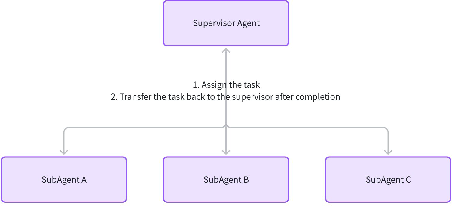 Supervisor Agent 是一种中心化多 Agent 协作模式,由一个监督者(Supervisor Agent) 和多个子 Agent(SubAgents)组成。Supervisor 负责任务的分配、子 Agent 执行过程的监控,以及子 Agent 完成后的结果汇总与下一步决策;子 Agent 则专注于执行具体任务,并在完成后通过 WithDeterministicTransferTo 自动将任务控制权交回 Supervisor。