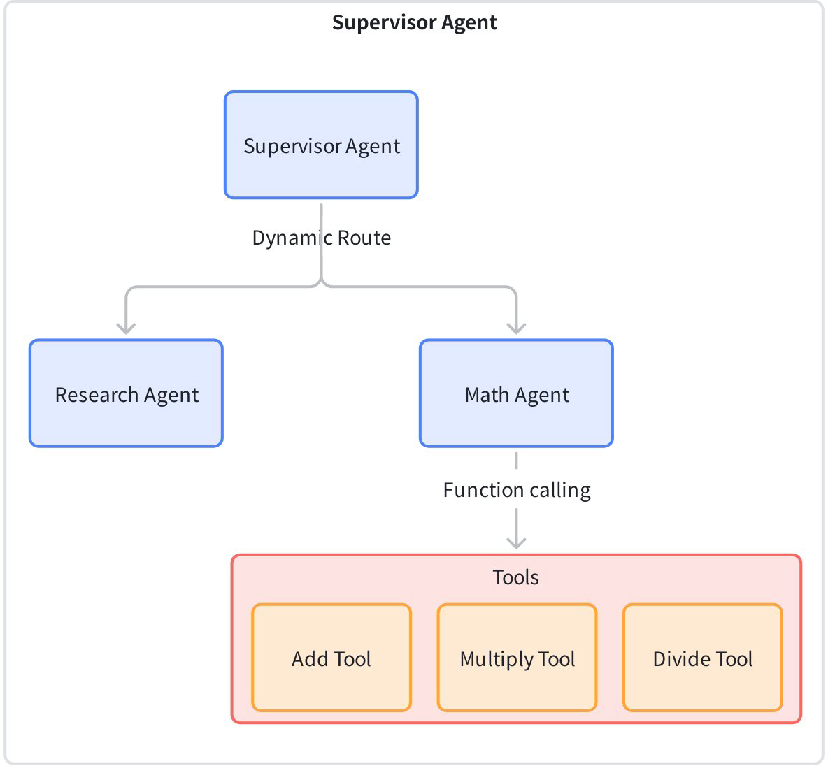 supervisor | 该用例采用单层 Supervisor 管理两个功能较为综合的子 Agent:Research Agent 负责检索任务,Math Agent 负责多种数学运算(加、乘、除),但所有数学运算均由同一个 Math Agent 内部统一处理,而非拆分为多个子 Agent。此设计简化了代理层级,适合任务较为集中且不需要过度拆解的场景,便于快速部署和维护。 | ![]() |