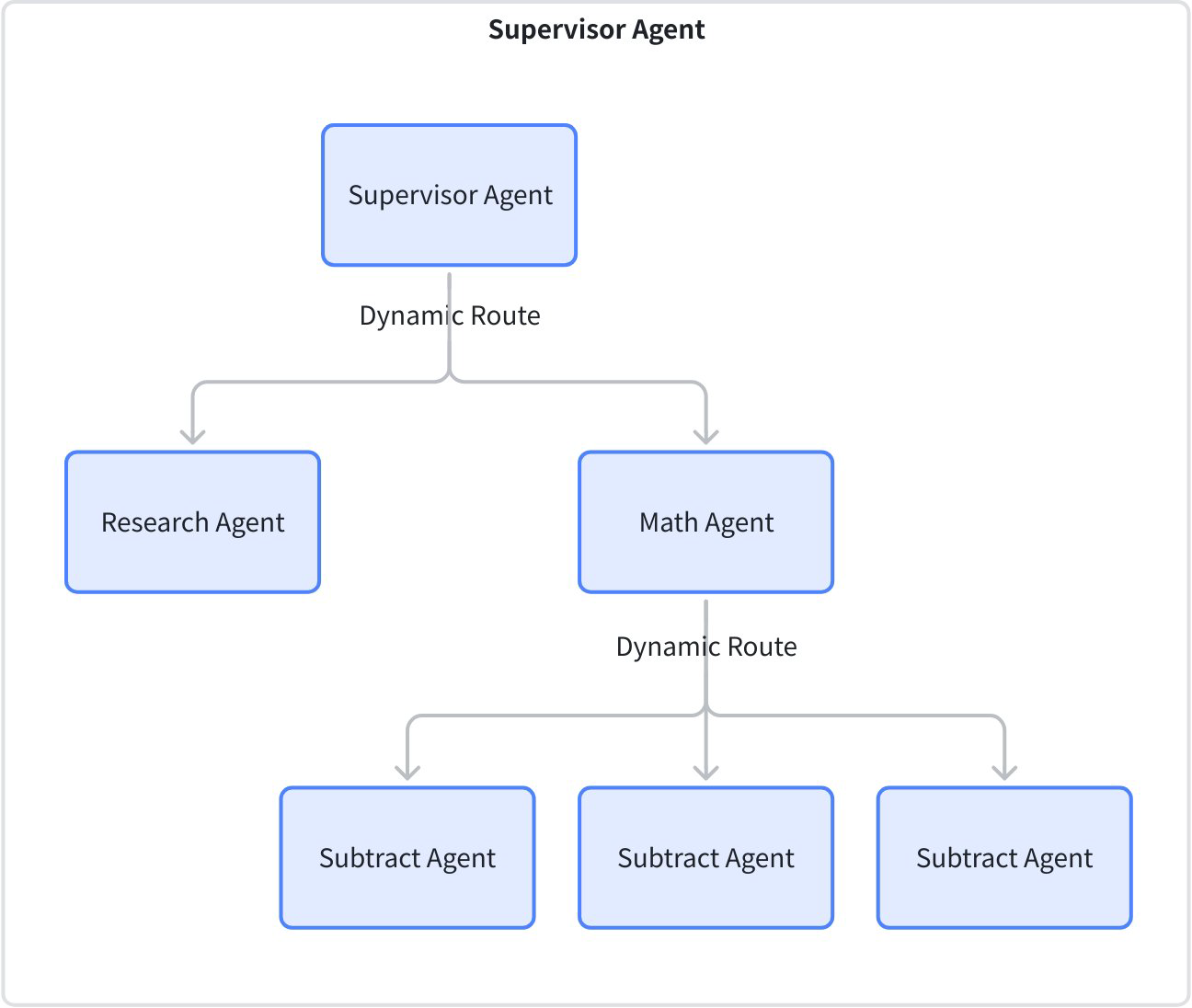 layered-supervisor | 该用例实现了多层级智能体监督体系,顶层 Supervisor 管理 Research Agent 和 Math Agent,Math Agent 又进一步细分为 Subtract、Multiply、Divide 三个子 Agent。顶层 Supervisor 负责将研究任务和数学任务分配给下级 Agent,Math Agent 作为中层监督者再将具体数学运算任务分派给其子 Agent。 | ![]() |